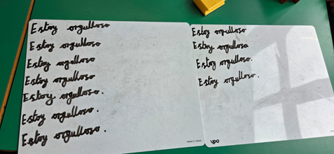 Drawing on Jamie Clark’s One Pageron mini whiteboards, @XpatEducatorjamieleeclark.com and other research, I have learnt that writing on a whiteboard activates both the visual and motor systems. Their surface is smooth and the pens seem to glide; this tactile nature appeals as a sensory experience. Whiteboards are also wonderfully low pressure (you can rub out and edit easily which is great for getting to grips with spellings and word order in a foreign language) and whatever is written isn’t going to be formally marked by the teacher. Pupils don’t need to copy the date or title before they begin writing (hooray!) and there are no lines to stick to. Handwriting can be as big as you like – the bigger the better in fact - we’ll come back to this later. Plus, there is a real sense of accomplishment at being able to fill the board with a few words or even a whole sentence in the target language.