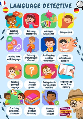 When we learn a foreign language, we are strengthening cognition by improving memory and concentration skills, building on creativity and problem-solving skills and developing empathy and social skills as a global citizen! You only have to glance at Primary Language Network’s 15 Language Detective skills to appreciate the transferable learning skills we are teaching in language lessons and how they develop the whole child.